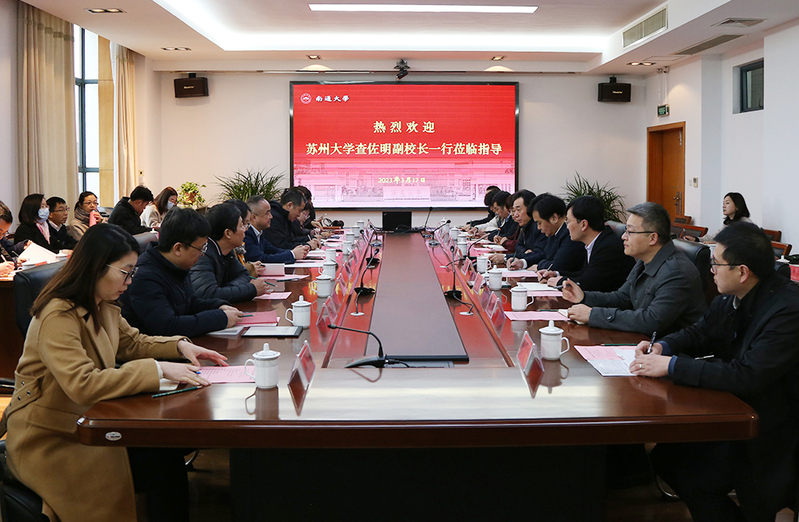 查佐明在讲话中对南通大学的热情接待表示感谢。他表示,南通大学办学历史悠久,与苏州大学有着深厚的渊源,此行是学习之旅、寻根之旅、探春之旅。他指出,南通大学连续两年在省属高校资产管理绩效评价中位列第一,在国有资产管理等方面有着丰富的实践经验,希望以此次调研为契机,加强沟通交流,相互学习借鉴,共同开创推动高质量发展的新局面,并欢迎南通大学来我校传经送宝。
